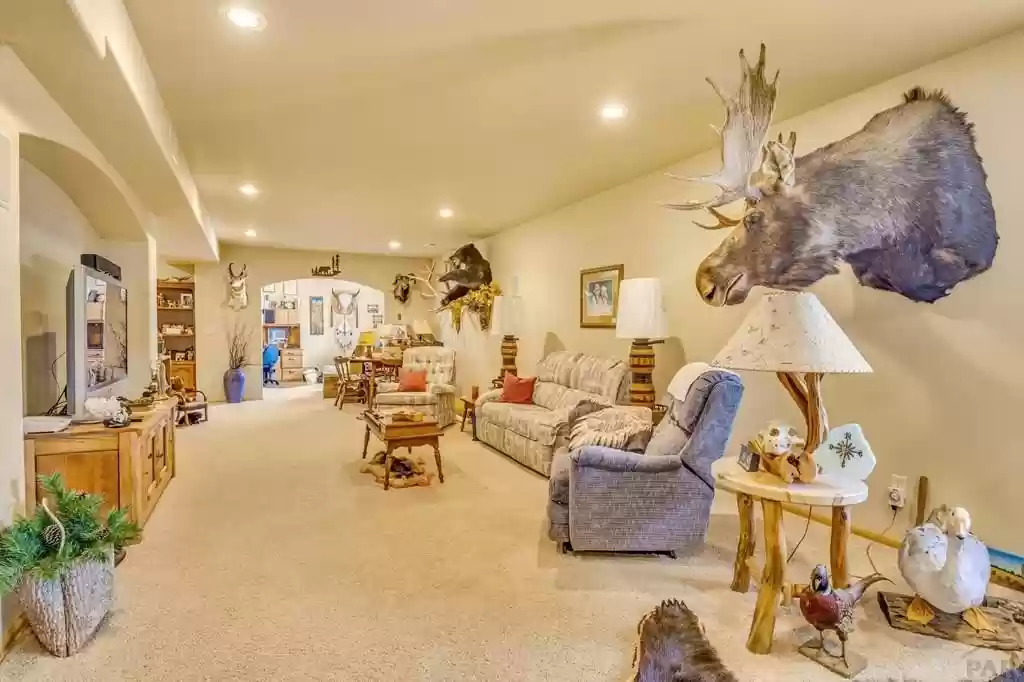 Looking for clean, immaculate and a lot of storage space with 3 car attached AND a 2 car detached garage? Look no further. This wonderful ranch style home offers a HUGE Primary bedroom with a five piece bath, taller cabinets and a jetted tub along with a large walk in closet.. Entry way is spacious and leads to a large kitchen with great cabinetry and a large dining room offering hardwood floors and a great mountain views. Main level laundry room with tile floors and cabinets for storing; back in the vast living room you will find a split floor plan with primary bedroom already mentioned and two large bedrooms each with a walk in closet! The doors in the home are worth mentioning as they are true wood doors. Linen closets and food storage along with an unfinished storage area are amazing! In the finished basement a family room with a pellet stove, and study/flex room (large desk will stay with property) along with a full bath and another large bedroom with a walk in closet. Reverse osmosis at the kitchen sink, water softener, humidifier with the furnace; outside is chip and seal from the driveway to the detached garage that is insulated . Class 4 roof p home; insulated and painted garage. RV parking with a 50 AMP station! . You really do not want to miss this home